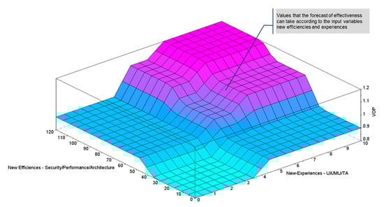 After shaping the fuzzy group, the probability group could be analysed for the value offer to be Effective, in accordance with the new experiences (User experiences, actionable intelligence, and transitory advantage) and the new efficiencies of the platform (security, performance, and architecture). By creating a program in the Scilab software with the previously established parameters, the output surface can then be plotted, by means of the Plotsurf function, which has been executed with the following Plotsurf parameters (fis, [1 2], 1, [0 0]), in this way, the effectiveness behaviour in the defined fuzzy group can be observed in Figure 7.