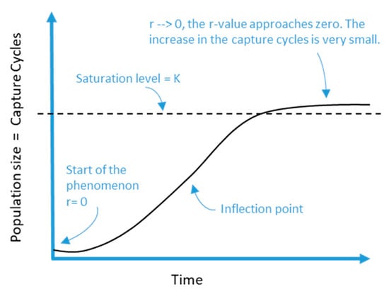 Reflecting on Figure 10, it is possible to discover its relationship with the population growth curves of the logistic type, which represents the growth of a population when its density exerts some pressure on the intrinsic rate growth, as shown in Figure 11.