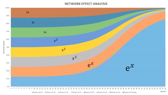 Analyzing the curve, it can be observed that the number of connections increases over time, taking the shape of a quadratic function (. Regarding the approximation of network growth, it does not give detailed explanation as to network behaviour, especially because of the supposition that the networks of connected homes are influenced by externalities. According to Larrosa [23], these externalities are caused by the limitations of valuing laws; so that it is inferred that laws such as Metcalfe’s require several assumptions that limit the projections. Nonetheless, this is an initial analysis and it could be argued that the connected homes’ growth curve is of interest to white goods companies. From a theoretical point of view, the development of home-related solutions has a lot of potential, this topic will be addressed in-depth in the network effect section.