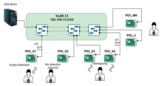 The scheme of the system is shown in Figure 1. The BLE signal detection can be based on a popular single-board Raspberry Pi microcomputer typically equipped with 802.15.4 BLE 4.1 modules and proper 802.3 and 802.11 network interfaces. The devices are connected to an IPv4 network capable of carrying information to the server. For the purposes of demonstration, the role of the network may be a dedicated VLAN, separated from the university network infrastructure. The prototype server was based on the influxDB solution.