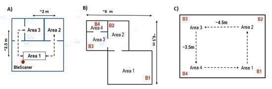Beacon arrangement during the first phase of the experiment: (A) scanning process reliability; (B) multiroom with weak overlapping; (C) single room with strong overlapping.