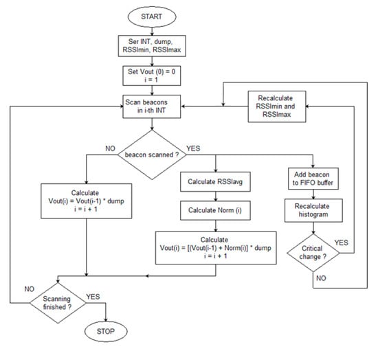The variables used in the algorithm are: RSSI (in dBm), Norm(i)—scaled value for the i-th interval, and Vout(i)—output value for the i-th interval. The algorithm parameters are: