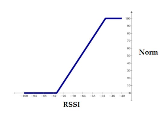 The process of scaling raw RSSI values essentially came down to using a look-up table (LUT) mapping RSSI(i) values to Norm(i) values. The general linear threshold shape of the transformation function is depicted in Figure 4.