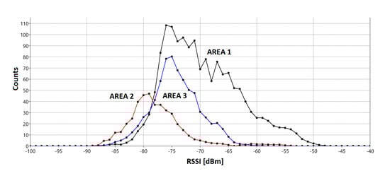 The PPE reliability factor reached 70% and more, which means that, e.g., for BI = 0.32 s, ~two independent signal strength measurements per second are anticipated. As expected, the average signal strength for AREA 1 was the highest, as was the PPE. In AREAs 2 and 3, more but comparably separated, the signal strength is noticeably weaker. Particularly, it was noticed that the signal from AREA 2 is weaker due to a metal locker placed in the room, which reduced propagation of the signal. Different signal parameters are reflected in the distribution (histograms) of the measurements, with a decrease in PPE from 80% to a mere 45% and an exceptionally high rate of critically weak signals (RSSI < −80 dBm), as shown in Figure 5.