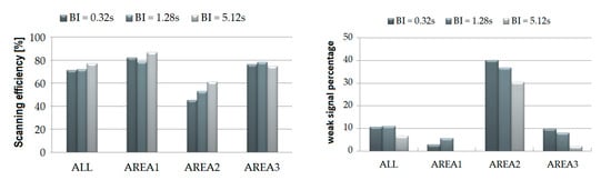 Using the tools presented in Section 4, the RSSI values for the case shown in Figure 2A were collected. The sequence of changes was (1–2–3–2–) × 10, with 30 s presence in each area. Thus, the total scanning time was 4 × 10 × 30 s = 20 min, whereby 25% of the total time was spent in AREAs 2 and 3 and 50% in AREA 1. The measurement was repeated for three different BIs: 0.32 s (2690 analyzed RSSI values), 1.28 s (672 analyzed RSSI values), and 5.12 s (180 analyzed RSSI values). Basic statistical measures were calculated, along with the distribution of numerical data (histograms). The base for the analysis was primarily RSSI values in the typical range: −100 to −30 dBm. Moreover, unexpected interruptions (so-called breakTime) were taken into account. Interruption was assumed critical if its time span was longer than ceil(3∙BI).