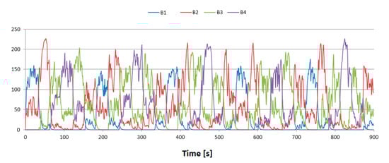 The number of samples in the considered case was 720 and corresponded to the signal measurements for every second from four scanners. The classes correspond to four locations (scanners) and there should be 180 observations in each of them. As shown in the inset table in Figure 9, the number of classified samples presented in a diagonal position for each class slightly differs from 180.