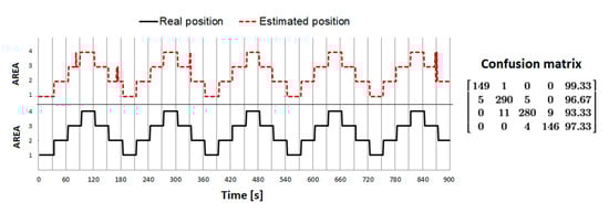 The highest PA, ~96.1%, was obtained for dump = 0.65 and low_perc = 0.4. As expected in the extreme positions (Area 1 and Area 4), the PA is greater, in the order of 98–99%. In addition, a location error often occurs during crossing area boundaries, which is a normal and acceptable situation. The VP error for individual positions was 2.7% for AREA1, 0.7% for AREA2, 3.7% for AREA3, and 3.3% for AREA4, and the total average error was ~ 2.4%.