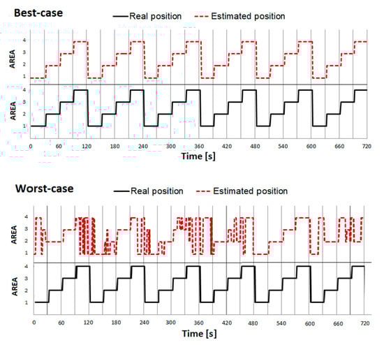 In this phase, the RSSI values for the case shown in Figure 2C were recorded. The sequence of changes was (1–2–3–4–) × 6, with 30 s presence in each area. Thus, the total scanning time was 4 × 6 × 30 s = 12 min, whereby ~25% of the total time was spent in AREAs 1–4. In addition, the experiment was carried out in two variants: the more favorable—back to the room, facing the emitter (best case), and the less favorable—front facing the room, back to the emitter (worst case). This is due to the fact that the beacon emitter was placed in the form of a necklace, located at the front at the level of the chest. It was to be expected that the propagation conditions along the emitter–scanner path would be different, mainly due to the wave absorption by the human body. This way, the effect of either the translational or rotational position was studied. Similarly, to experiment B, the position agreement was determined—Figure 8.