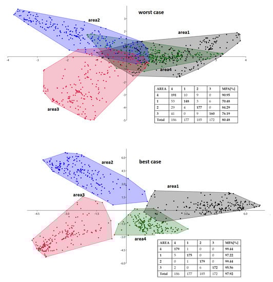 An effective way of assessing the ability to discriminate profiles is to perform a linear discriminant analysis (LDA). The objective of the LDA is to estimate discriminant functions that are a linear combination of independent variables that will discriminate between the categories of the dependent variable in the most effective manner. It also evaluates the accuracy of the classification. In the considered case, the canonical variate analysis (CVA) method was used [38]. Results for phase 1C experiments are presented in Figure 9.