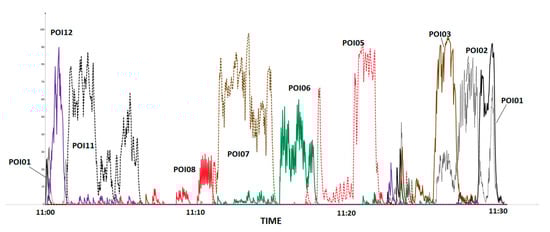 The second phase of the experiment focused on obtaining data in an environment similar to real-life conditions. For making it possible, a prototype sensor network was built, where models of attractions (POIs) were included. Multimedia presentations displayed on 17” screen notebooks were considered as attractions. Presentations were focused on tourism and entertainment, and each was 3 to 5 min long. Initially, 12 attractions were prepared, and 9 of them were included in the experiment. The POIs were located in the halls of a two-story building, and they were separated by at least 10 m of distance. The precise location of POIs is given in Table 1. Every POI was supplemented with an Android device, which was stationary during the experiment. As previously, the BleSkaner+ application was used for scanning mobile Bluetooth beacons carried by visitors. The collected raw data were processed according to the developed algorithm and supported by the middleware software described in Section 4.3.