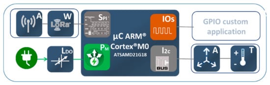 The long range transceiver is the module RFM95 with a frequency of 868 MHz. Its main features are its high sensitivity below −148 dBm combined with the +20 dBm integrated power amplifier. Its modulation modes are FSK, GFSK, MSK, GMSK, LoRaTM and OOK. The connection interface between the microcontroller and the transceiver is SPI (Serial Peripheral Interface). Finally, the whole system is finished with an omnidirectional antenna of 1dBi gain. In addition, the module incorporates a triaxial MEMS lis3dh accelerometer and a general-purpose input-output connector. Lastly, the Power Supply consisting of a TPS7A05 low quiescent current low drop regulator. Figure 2 shows the block diagram of the module.
