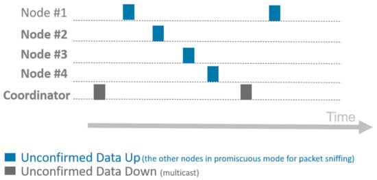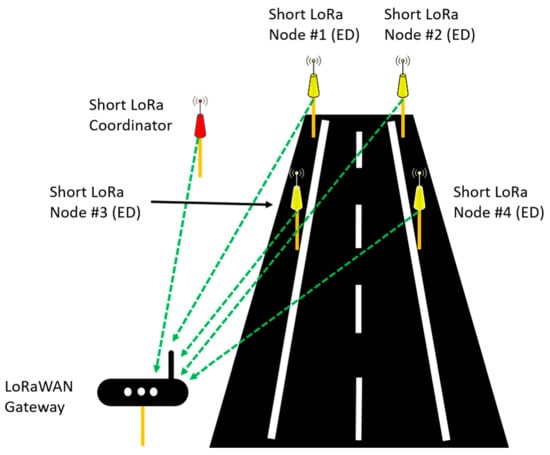 Following the LoRaWAN standard implementation Short LoRa use the same star topology, where the coordinator node is the frame sender in mode multicast, and this node is responsible for network synchronization and the final collection of data for further processing. The rest of the nodes (#1, #2, #3, #4) are promiscuous mode interface network for packet sniffing so that they can also measurement RSSI with each other and be able to detect vehicles. In addition, ED nodes are defined as Class A in LoRaWAN network, that according to LoRa [20] allows for bi-directional communications. Short LoRa sub-network use a specific single channel to work, which makes it different from the channels used by LoRaWAN. The specific operation of the network for vehicle detection will be presented in Section 2.4.