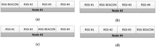 The RSSI values transmitted by Node #1, Node #2, Node #3 and Node #4 are shown in Figure 9a–d, respectively.