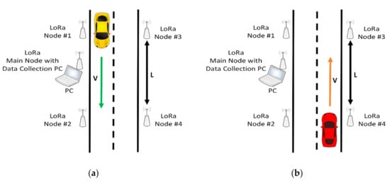 Different tests have been carried out in order to verify and validate the operation of the proposed system. The diagrams in the Figure 10 shows the configurations and the arrangement of the different elements of the vehicle circulation detection system on the road.