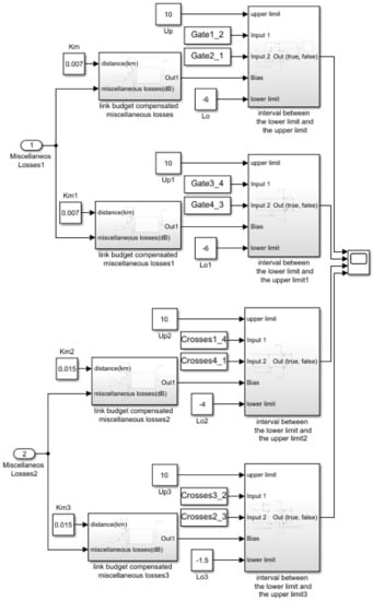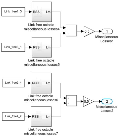 Figure 15 shows the rest of the detection algorithm. In it we can see how the miscellaneous loss data calculated using the blocks in Figure 14 is entered into a new block. In this calculation block, the theoretical calculation of communication losses between gates or between crosses is obtained, taking into account the free space losses for the separation distance of these communications or these nodes. Miscellaneous losses are added to this calculation, which are assumed to be the same for all communications in the system, since they are within the same environment. With this, a base band or bias level is established on which to compare fluctuations in the reception power.