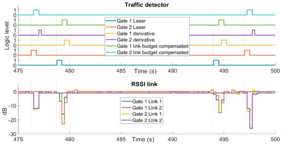 The lower graph of Figure 16 shows the attenuations produced in the RSSI value with the passage of vehicles with respect to an attenuation level of 0dBs. The attenuations of the transmissions of both gates and of the bidirectional communication of the pairs of nodes that form each of them are presented separately. The graph refers to these signals as Gate 1 Link 1, this being the communication from node #1 to #2; Gate 1 Link 2 from #2 to #1; Gate 2 Link 1 from #3 to #4 and Gate 2 Link 2 from #4 to #3, thus representing all the detection signals present between the gates communications.