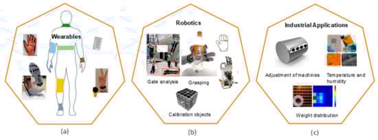 Examples of applications of strain and pressure sensor based stretchable and flexible nanocomposites: (a) wearables for human activity tracking and medical applications, (b) robotics application for grasping, humanoid robot gait analysis and calibration objects and (c) industrial applications.