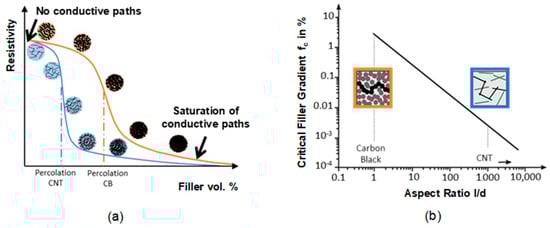 Influence of filler type: (a) composite resistivity behavior in dependence on filler volume concentration of carbon nanotubes (CNTs) and carbon black (CB), (b) critical filler gradient in dependence on the aspect ratio.