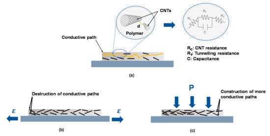 The behavior of CNTs/polymer nanocomposites can be attributed to inverse mechanisms as depicted in Figure 3. In the case of tensile stress, mainly following phenomena take place: (a) Decrease of CNTs conductive baths due to loss of CNTs contact becoming more tunneling-dominated ones, (b) tunneling conduction mechanism influencing conductivity change in adjacent CNTs due to gap variation between CNTs and (c) intrinsic conductivity changes of CNTs due to deformation. Application of strain leads therefore to bending and rearrangement of CNTs in the host polymer, which results in the initialization of new paths and destruction of some others.
