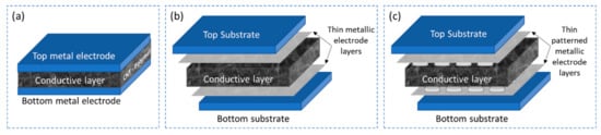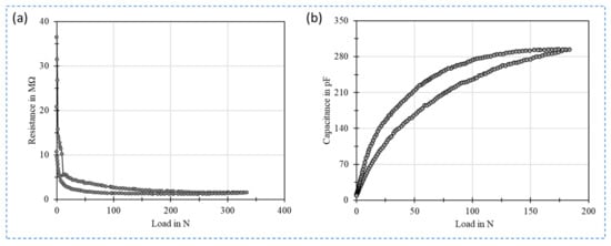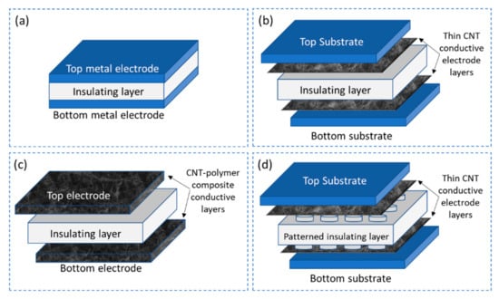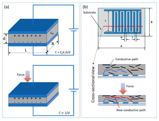 Piezocapacitive sensors based on parallel plate electrode structures work on the principle of change in capacitance as the area between the parallel plate changes under shear force or the distance between the parallel plate changes under perpendicular force. The capacitance of such sensors can be easily computed using the relation , where is the dielectric constant of the material between the parallel plate electrodes, A is the area and d is the distance between the parallel plate electrodes as represented in Figure 4a [38]. These sensors are highly suitable for measurement of small forces with high sensitivity due to the highly flexible soft elastomer that comprise the dielectric layer. Theses sensors work with both insulating and conducting dielectric layer. However, the sensors based on interdigital electrode structures always require a conductive layer that is placed on top of the electrode layer. The capacitance of such a sensor is a parallel combination of individual sensor capacitance between each electrode pair. Upon application of pressure the change in capacitance of the sensor is a result of integral change in individual capacitance of each electrode pair. This change in capacitance inherently comes from the change in tunneling capacitance between the CNTs as they come close to each other under compression and the movement of CNTs towards the electric field distribution of the underlying electrodes as represented in Figure 4b [37].