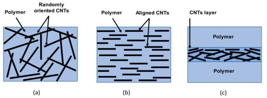 Different polymer/CNTs architectures: (a) randomly oriented polymer/CNTs nanocomposite, (b) aligned CNTs in polymer matrix and (c) sandwiched CNTs layers between two layers of polymer.