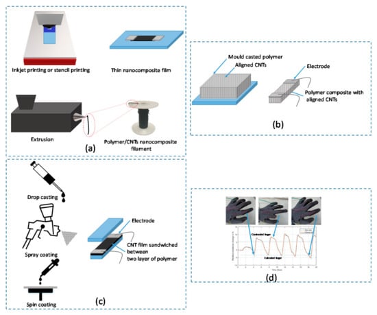 Different sensors architecture, deposition techniques and potential application (a) Strain sensor based on randomly oriented CNTs, (b) sandwiched CNTs based strain sensor (c) strain sensor based on aligned CNTs and (d) potential of filament strain sensors for wearable application.