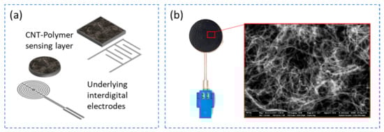 Conduction mechanisms of polymer/CNT pressure sensor based on piezocapacitive working principle: (a) sensors based on parallel plate electrode structures and (b) sensors based on interdigital electrode structures.