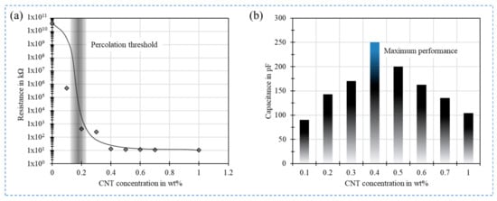 To date, numerous works reported on new approaches for fabrication of flexible, stretchable and sensitive force sensors. They are mainly based on the use of sensitive materials coated on a flexible substrate [10] or a stretchable sensitive material [11]. These sensitive materials can realize sensors having different principles, such as piezoresistive [12,13], piezoelectric [14], and capacitive [15] principles. Nanocomposite piezoresistive and piezocapacitive materials provide a good alternative to conventional materials owing to their higher sensitivity, easy manufacturing [16]. Especially, materials based on polymer nanocomposites containing smart carbon nanomaterials, such as graphene [16], carbon nanotubes (CNTs) [17,18,19,20] gained tremendous attractivity in the realization of pressure and strain sensors due to their superior sensitivity, their outstanding mechanical and electrical properties, in addition to the possibility of tunability of the material properties of the nanocomposite, which can be realized in respect to the desired application requirements. Particularly, polymer/CNTs composites have enhanced mechanical and electrical properties in comparison to the other nanofillers. In fact, CNTs have a large aspect ratio (diameters ranging from 1 to 100 nm and lengths of up to mm) and a conjugated structure promoting a ballistic charge transport. Hence, electrical conductivity of composite is enhanced at a very low concentration in comparison to other conductive fillers (Figure 2a,b).