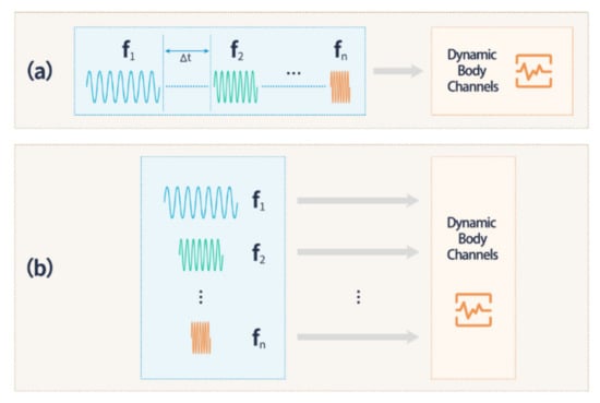 To date, modeling and measurement of motionless body channel characteristics have been extensively studied [6,7,8,9], while few research studies on dynamic channels have been reported [10,11]. In the studies of motionless measurements, single-frequency measurements or frequency-sweep operations are mostly employed, hereinafter referred to as traditional methods. Single-frequency measurements are mostly performed using a signal generator combined with an oscilloscope [12,13,14,15,16]. Where available, frequency sweep measurements are typically carried out using a high-precision instrument such as a spectrum analyzer [17,18,19]. However, measuring time has rarely been considered in the traditional methods. As shown in Figure 1a, the total measuring time for traditional methods includes the measuring time for each frequency and the interval time (∆t) between the frequencies. The total time can be much longer than the body channel variations because of the cardiac or other activities. Therefore, the traditional schemes do not represent a comprehensive tool to evaluate many dynamic body channels. On the other hand, researchers have explored the differences between the human body in dynamic and motionless situations. For example, Schenk et al. [20] investigated the channel characteristics when the human body is walking, standing, and moving the arm up and down versus sitting in a stationary position. Wegmuller et al. [21,22] extensively explored the variations in the effect of galvanic coupling IBC during human activities. Callejon et al. [12] also discussed the influences of human motion on capacitive coupling versus galvanic coupling IBC.