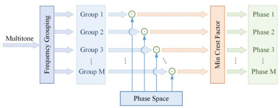 To minimize the crest factor, the phase of individual excitation frequency φn can be adjusted by our proposed group search algorithm. This algorithm based on the principle of the partial transmission sequence technique, which is commonly used in Orthogonal Frequency Division Multiplexing (OFDM) systems, to reduce the peak-to-average ratio (PAPR), as shown in Figure 2.