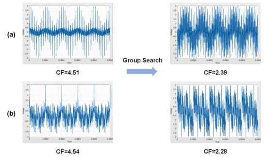 The time domain waveform and its crest factors (CF) of the multitone before and after group search algorithm. (a) denotes linearly distributed multitone and (b) denotes quasi-logarithmically distributed multitone.