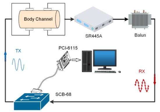 To test and validate the performance of the proposed parallel measurement for dynamic body channel characterization, a multitone excitation measurement platform was built (shown in Figure 4). A computer equipped with a multifunction high-speed digital I/O card (PCI-6115, National Instruments, Austin, TX, USA) (10 MS/s/ch, 12 bit) with its matching terminal block SCB-68, was used to generate the multitone excitation and receive the responses from the body channel via a signal amplifier (SR445A, Stanford Research Systems, Sunnyvale, CA, USA). Additionally, a balun transformer (FTB-1-6*A15+ (50 Ω), Mini-Circuits, New York City, NY, USA) was used to break the ground loop between the transport (TX) and receive (RX) of the measurement.