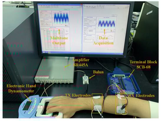 During the experiment, we recruited a volunteer (male, 24 years old, 172 cm, 58 kg) to participate and his forearm was selected as the measurement site. A four electrode (physiotherapy electrodes, 24 mm × 24 mm, Shanghai Trans Health Biotechnology Co., Ltd., Shanghai, China) arrangement, which formed a typical galvanic coupling IBC configuration, was made for testing the proposed parallel multitone excitation method.
