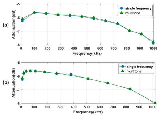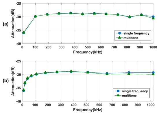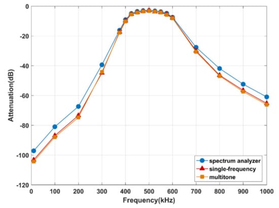 Figure 7 presents the results of the standard filter (center frequency 500 kHz, bandwidth 100 kHz, matching impedance 50 Ω) measurements using a spectrum analyzer (CXA N900A, Agilent Technologies Inc., Santa Clara, CA, USA) (blue) against the measurement system designed in this manuscript (red and orange). For measurements with attenuation above −40 dB, the concordance correlation coefficient between multitone and spectrum analyzer is 98.7%, which demonstrates that the accuracy of the measurement system in this paper is nearly identical to that of the spectrum analyzer in that range. Regarding the experiment preformed in this research, the attenuation was generally above −40 dB. Therefore, the experimental system proposed in this article is suitable and accurate enough. On the other hand, Figure 7 also shows that the measurements with the single frequency method and multi-tone method are very close. The concordance correlation coefficient between the results of the two methods is 99.9%, which also indicates that the multitone excitation strategy is equivalent to the traditional single-frequency measurements.