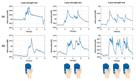 The dynamic body channel characteristics of the volunteers performing 1, 2, and 3 grip strength tests under (a) 550 kHz in linear distribution and (b) 510 kHz in quasi-logarithmic distribution.