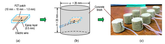 As shown in Figure 4, a PZT-embedded smart rock was designed for the structural health monitoring of concrete structures. The PZT 5A patch was 10 mm × 10 mm × 1 mm in size, and it was welded with an electric wire in order to ascertain the impedance responses. Furthermore, the PZT patch was covered by 0.5 mm thick epoxy in order to waterproof it and insulate it from electricity (see Figure 4a). Then, the protected PZT was placed in a small concrete block (φ 26 mm and H = 26 mm) before casting (see Figure 4b). The concrete mixture for the anchorage zone is listed in Table 1. As noted in the table, the size of the smart rock is simplified as Dmax of the aggregate. A concrete mixture including cement, sand, and water (without aggregate) was used for the fabrication of the smart rocks. Figure 4c shows the samples of PZT-embedded smart rock at 24 h after the removal of the frameworks. The smart rocks were used to analyze the realistic performance under compression, as described in Section 3.2 and Section 3.3. They were embedded into a concrete anchorage zone (detailed in Section 4) for impedance-based damage monitoring.