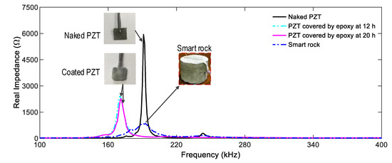 Figure 5 shows the impedance spectra of naked PZT, coated PZT (covered with epoxy resin at 12 h and 20 h), and PZT embedded in concrete (smart rock). This figure shows the information on how the process affects the PZT’s impedance signals. Peak 1’s impedance of the naked PZT was 191.5 kHz, and it had the highest real impedance magnitudes. The impedance frequency and its magnitude were reduced when the PZT was coated with the epoxy. This observation was consistent with the previous study [40]. During the development of the strength of the epoxy and concrete, Peak 1’s impedance reduced in magnitude and increased in frequency. Conversely, the impedance signals of the smart rock would be increased when the concrete is damaged and the constrain condition of the PZT patch is released, indicating that the PZT-embedded smart rock would disclose the occurrence of damage in the concrete.