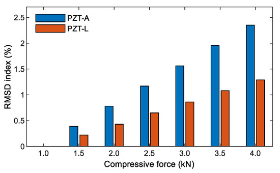 RMSD indices of the numerical impedance responses of the PZT sensors under compression.