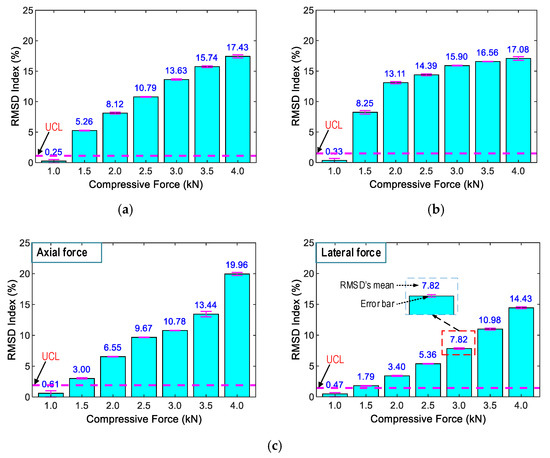 Ideally, the RMSD value should be larger than zero if the compression forces increase (i.e., the stress variation); otherwise, it should be zero. However, the statistical index of the RMSD can be larger than zero due to experimental and computational errors, even if there are no changes in the applied forces. The upper control limit (UCL) [43] is established for decision making on the stress variations as follows: