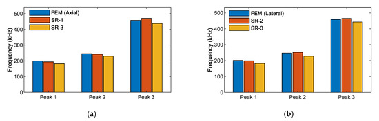 Figure 12 shows a comparison of the numerical and experimental impedance frequencies for Peaks 1–3 under axial and lateral compressive forces. The differences in the impedance frequencies are relatively small (less than 3% for SR-1 and SR-2). Meanwhile, Peak 1’s frequency of SR-3 was about 7% different from those of SR-1, SR-2, or the numerical result. Furthermore, the impedance spectra of SR-3 had a broader bandwidth than those of the other smart rocks. The differences could come from an inaccurate thickness of the epoxy layer among the coated PZT sensors. The previous study showed that the thickness of the adhesive layer had significant impedance responses [48,52]. Despite that, the FE tool was applicable for the analysis of the impedance responses of the PZT-embedded smart rock.