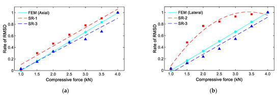Comparison of the rate of the RMSD indices of the PZT-embedded smart rock. (a) Under axial compressive force, (b) Under lateral compressive force.