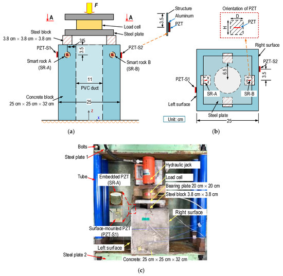 A lab-scale experiment on a concrete anchorage zone equipped with smart rocks was conducted in order to evaluate the feasibility of the PZT-embedded smart rock for the health monitoring of the anchorage zone, as schematized in Figure 14. The anchorage zone includes a concrete block (25 cm × 25 cm × 32 cm) and four steel-blocks (3.8 cm × 3.8 cm × 3.8 cm), which played a role as a bearing plate [53] in order to transfer the compressive forces to the structure. The steel blocks were evenly distributed on the concrete surface, and their distance to the center of the anchorage was 6.5 cm (see Figure 14b). A cylinder (φ 110 mm, made of PVC, Polyvinyl chloride) played a role as a duct for the cables (see Figure 14a). For the feasibility evaluation of the smart rock, the anchorage zone was designed without reinforcement. The material properties of the concrete are listed in Table 3, with a compressive strength σc = 23.3 MPa.