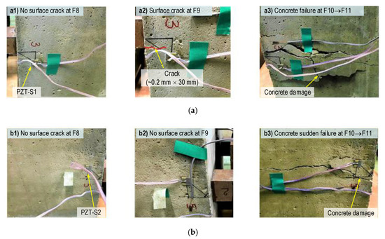 For SR-A (see Figure 16a), the impedance signals were insignificantly varied under forces F1–F6. The impedance signals were suddenly changed under force F7, thus revealing the transformation of the concrete medium around SR-A (e.g., inner concrete damage [40]). The impedance responses were continuously altered under force F8, and it underwent another abrupt change under force F9 (an incipient surface crack close to SR-A). The impedance signals varied under force F10 (crack propagation), and they showed the most variation under force F11 (concrete failure). For SR-B (see Figure 16b), the impedance signatures showed insignificant variations under forces F1–F10. The substantial alteration only occurred as the anchorage zone collapsed (under force F11).