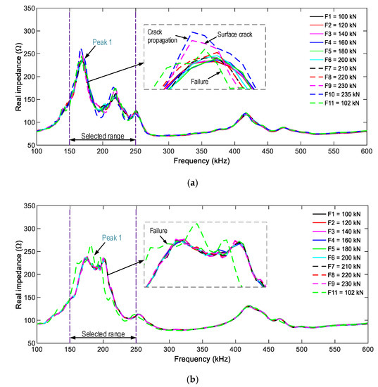 Figure 17 shows the impedance responses of the surface-mounted PZT-S1 and PZT-S2 (in the frequency range of 100–600 kHz) under the eleven loading cases. There were several resonant peaks in the examined ranges, and Peak 1’s impedance also showed the most variation. For PZT-S1 (see Figure 17a), the impedance signals showed insignificant changes under forces F1–F8. The impedance signals suddenly changed under force F9. The signals kept changing under forces F10–F11. For PZT-S2 (see Figure 17b), the impedance signatures showed ignorable changes under forces F1–F10, and showed a rapid change when the anchorage zone was partially damaged (the force F11).