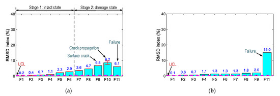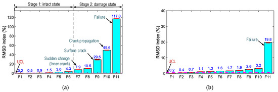 Figure 19 shows the RSMD indices of PZT-S1 and PZT-S2 computed for the 11 loading cases. The RSMD magnitudes were ignorable (i.e., 0.2%) in the intact case. For PZT-S1 (see Figure 19a), the RMSD values (0.2–8.7%) gradually increased under forces F1–F10, and the value (i.e., 6.1%) was reduced under force F11. For PZT-S2 (see Figure 19b), the RMSD values were stably small (<2.0%) under forces F1–F9, and the RMSD index was a significant value (15.0%) when the concrete was damaged.