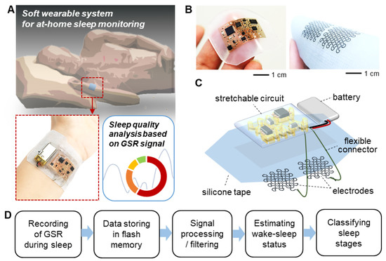Among non-invasive physiological signals, galvanic skin response (GSR) can be measured as a skin conductance controlled by the human body’s sympathetic nervous system [14,15]. Due to the relationship between the sensing mechanism of GSR and sleep regulated by the autonomic nervous system [16], GSR has been attracted as a simple, autonomic analytic solution for a sleep monitoring system. A recent study shows that GSR can determine sleep stages by monitoring the elevated signal frequency at deeper sleep stages [17,18,19]. A significantly lower GSR frequency was identified during the rapid eye movement phase [20,21]. Other papers analyzed GSR to classify the status between sleep and wake [22,23]. GSR signals have been measured on the fingers or palm area with multiple electrodes and data acquisition system [24], which allows the sensor location apart from the facial area that can disrupt natural sleep patterns, unlike the conventional PSG system. Although recent GSR devices are integrated with wearable electronics, they still rely on heavy and rigid sensors [25,26]. These devices require a tightly worn strap, band, or aggressive tapes to secure the sensor contact to the skin [27,28,29]. However, the mechanical mismatch of electronics and soft skin still causes motion artifacts and significant signal degradation during sleep.