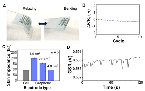 Characterization of mechanical and electrical properties of printed graphene electrodes. (A) Photos of a graphene electrode under cyclic bending. (B) Result of measured resistant change of the electrode in (A) with ten repetitive bending cycles up to 180 degrees. (C) Skin-electrode contact impedance on the wrist with different sizes of graphene electrodes and the comparison with a commercial gel electrode. Error bars indicate standard deviation from five trials (n = 5). (D) Measured GSR data from the wrist using the biggest graphene electrode (area = 4 cm2) in (C).