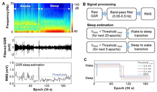 Determination of the wake-sleep transition based on GSR signals and validation with EEG signals. (A) EEG spectrogram measured on the forehead that differentiates the transition between awake and sleep (top), band-pass filtered GSR data measured on the wrist (middle), and RMS data from the filtered GSR for determination of sleeping (bottom). (B) Signal processing method of GSR data and sleep estimation process based on the RMS threshold. (C) Optimization of the threshold values to determine the sleeping transition in comparison with the EEG data.