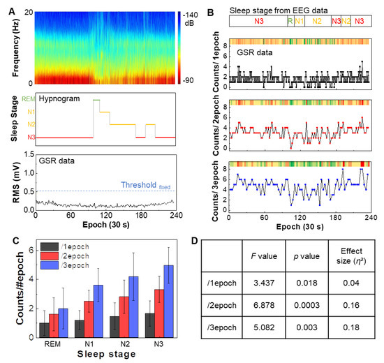 Determination of four sleep stages based on GSR data. (A) Raw EEG spectrogram measured during sleep (top), hypnogram derived from the EEG data showing four sleep stages, including REM, N1, N2, and N3 (middle), and measured GSR data during sleep (bottom). The RMS values from GSR data show a continuous low tendency below the fixed threshold, verifying the entire epochs are in sleep status. (B) Comparison of classified sleep stages from EEG data with GSR data in three epochs. (C) Summarized correlation between sleep stages and GSR counts from three epochs in (B). Error bars: standard deviation from three trials. (D) Summary of statistical analysis using ANOVA, showing the data significance in (C). High significance is identified in epoch 2 (F = 6.878, p = 0.0003, η2 = 0.16).