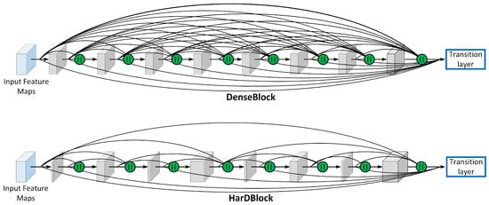 Concatenation scheme comparison between the DenseBlock and the HarDBlock. The HarDBlock is named after the harmonic wave patterns that describe its concatenation scheme. “” denotes concatenation process.
